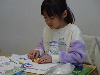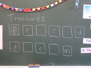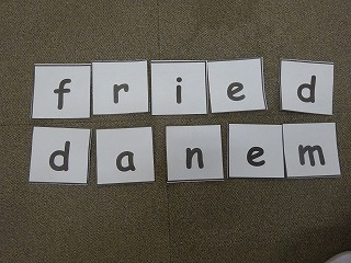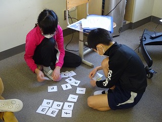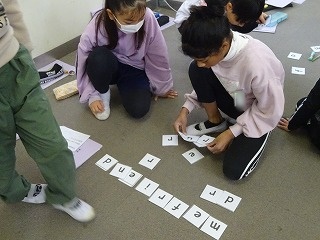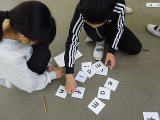 配られたアルファベットのカードを並び替えて、英単語をつくります。