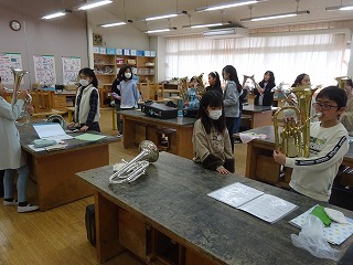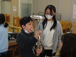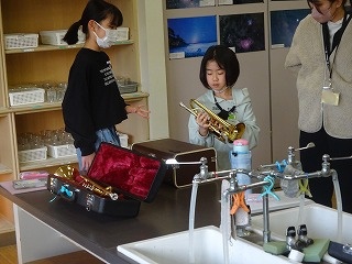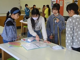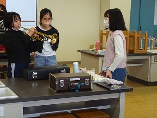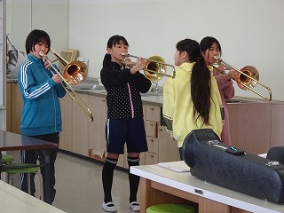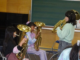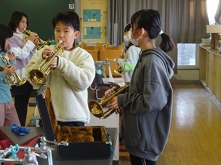 初めて楽器を手にした4年生のために,5年生がとても丁寧に音の出し方などを教えてくれています。その姿を6年生は,優しく温かく見守ってくれています。