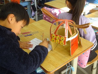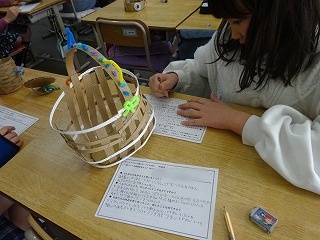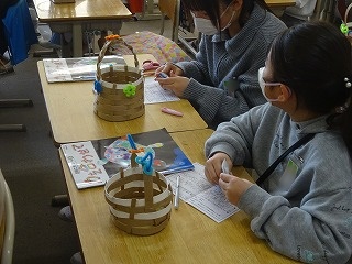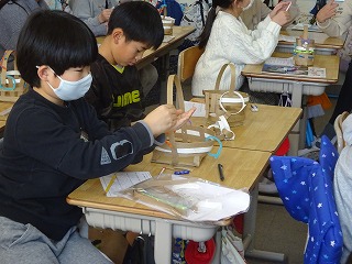 紙バンドの組み合わせ方や,つなぎ方を工夫して入れ物を作りました。