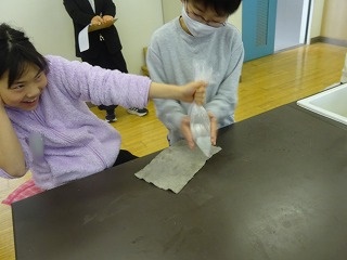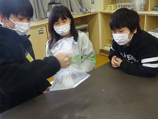 ビニール袋を振ったり横から押したりして,卵が割れるか割れないか実験しました。
