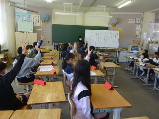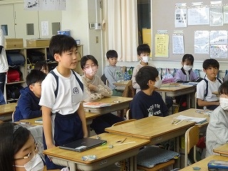 昼休みに,4~6年の学級代表と各委員会の委員長が集まり,「今月のめあての反省」と「来月のめあてについて」話し合い,連絡やお願いごとを伝えました。