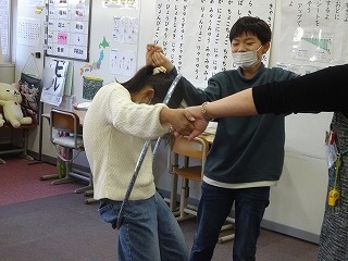 フラフープをくぐることで,運動機能を高める学習を行っています。