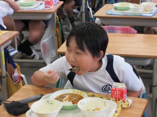 今日の給食はみんなが大好きなカレー・野菜チップス・サラダ・牛乳。
