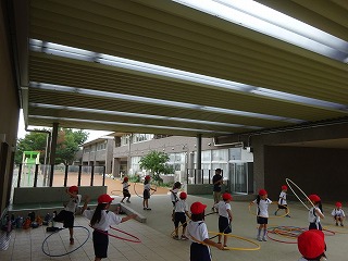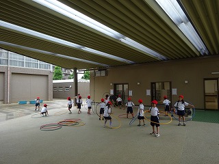 校舎と校舎をつないている大きな屋根があるので,雨をしのいで運動ができます。