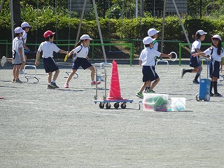 低い障害物を使って,折り返しリレーを楽しんでいます。