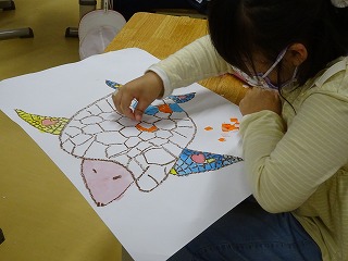 折り紙を使ってカメの甲羅を仕上げていきます。