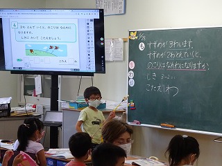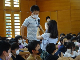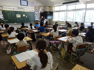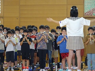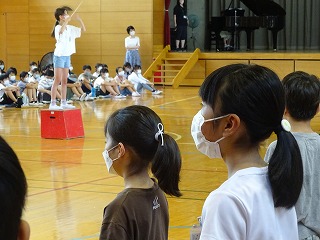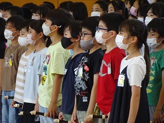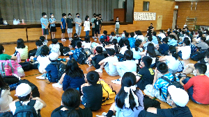 本校では,学年間の交流等を目的として,音楽の授業で取り組んでいる内容を中心に,2学年で発表し合ったり,今月の歌を合わせたりして,「音楽交流会」を行っています。1学期は4年生と6年生,2学期は2年生と5年生,3学期は1年生と3年生が発表する予定です。