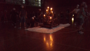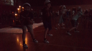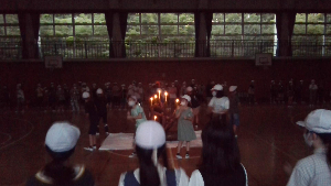 朝から続いていた強風がおさまらず、キャンプファイヤーができませんでした。その代わりに、体育館でキャンドルサービスを行いました。