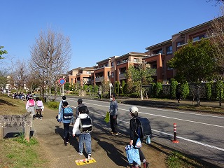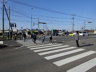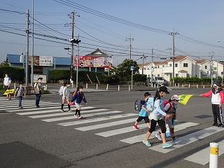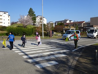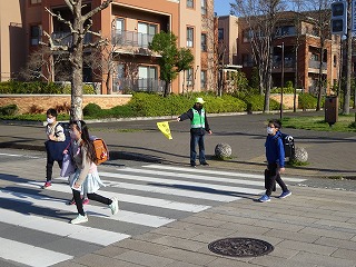 子どもたちが安全に登校できるように、大人たちが見守っています。