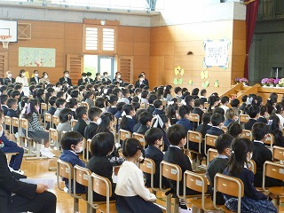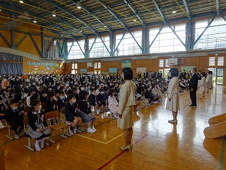 「校長先生から、みなさんに一つお願いがあります。それは、どんな時も、どんな友だちにも、優しくしてください。みんながそうしていけば、原小学校はずっと優しさ溢れる素敵な学校であり続け、一人一人が幸せな気持ちで生活できます。今日から、今まであまり話したことがない友だちに声をかけて、良いところを発見して、仲良くなってほしいと思います。優しい人の周りには、優しい人たちが集まります。校長先生は、そう信じています。今日からよろしくお願いします。」