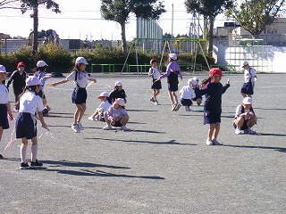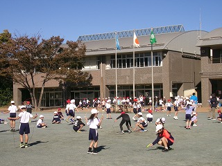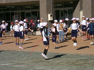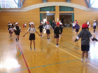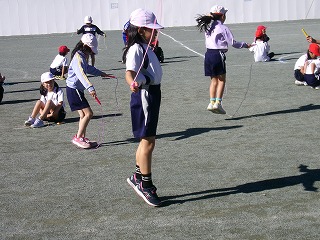業間休みに、低学年は縄跳びを行い、体力づくりに取り組んでいます。