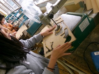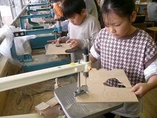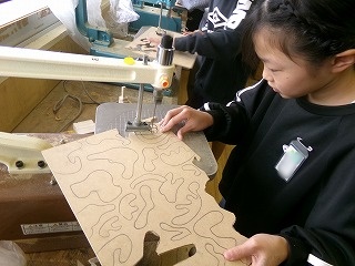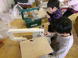 糸のこぎりを使って木を切っています。