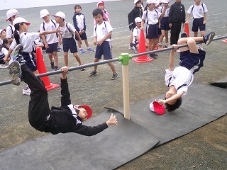 手足を使ってぶら下がり、友達とジャンケンをしています。