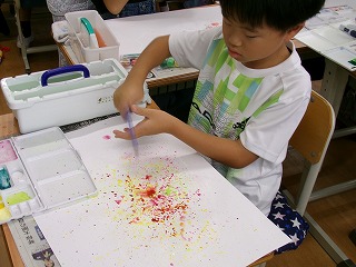 今日の課題は、「すてきな形に絵の具をたらして、きれいなにじみをつくろう。」です。
