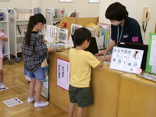 本を借りる手続きをしています。