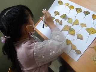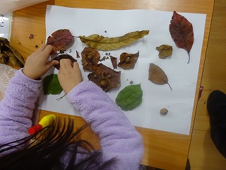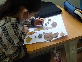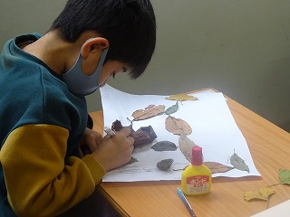 先日,草深公園で拾い集めた落ち葉やどんぐりを使って,それぞれ自分の作品をつくっています。